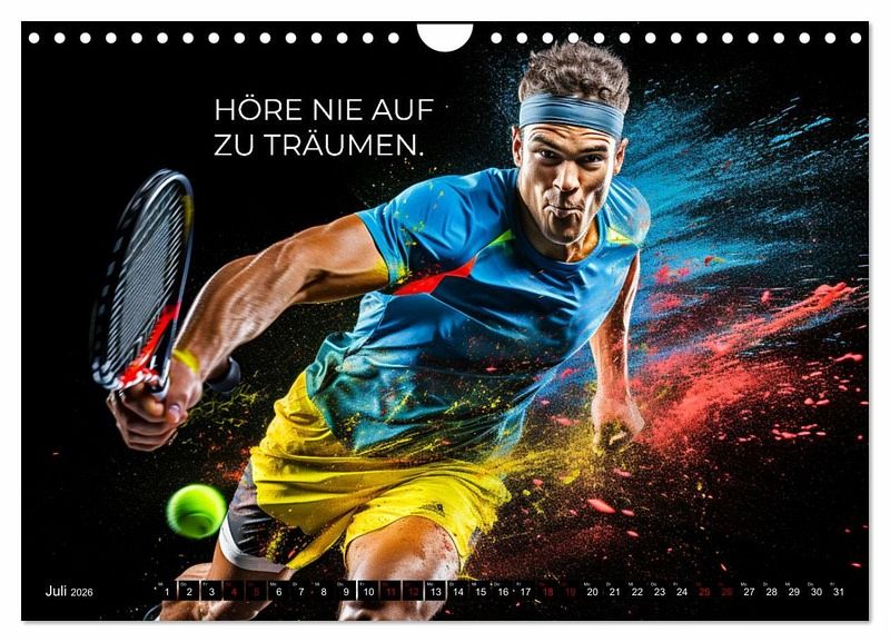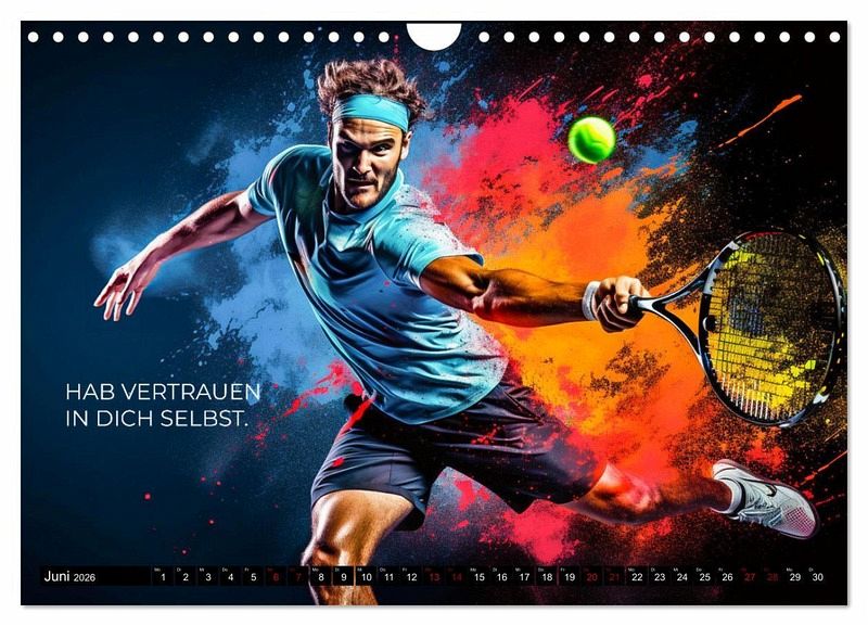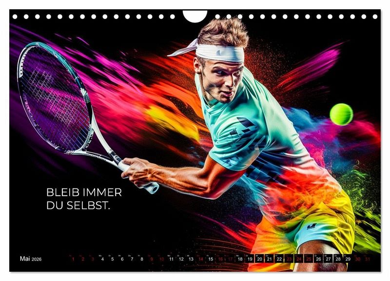 Erlebe das Jahr voller Power und Inspiration mit unserem einzigartigen Wandkalender 'Tennis & Motivation' - das perfekte Geschenk und Mitbringsel für alle Tennisfans und Sportbegeisterten! Unsere hochwertigen Bilder fangen die Dynamik des Spiels ein und lassen dich das Adrenalin auf dem Platz spüren. Gleichzeitig sorgen die motivierenden Sprüche dafür, dass du das ganze Jahr über deine Ziele nicht aus den Augen verlierst. Ob du selbst ein leidenschaftlicher Tennisspieler bist oder jemanden kennst, der den Sport liebt, unser Wandkalender 'Tennis & Motivation' ist das ideale Geschenk für jeden Anlass. Geburtstage, Feiertage oder einfach als Überraschung zwischendurch - dieser Kalender zaubert jedem Tennisfan ein Lächeln ins Gesicht.Sichere dir jetzt unseren 'Tennis & Motivation' Wandkalender und genieße 12 Monate voller Energie, Leidenschaft und Inspiration. Zeige deine Liebe zum Tennissport und motiviere dich oder deine Lieben mit diesem besonderen Geschenk. Bestelle noch heute und freue dich auf ein Jahr voller sportlicher Triumphe und positiver Energie! Erstellt wurden die Bilder im übrigen mit KI und Photoshop.