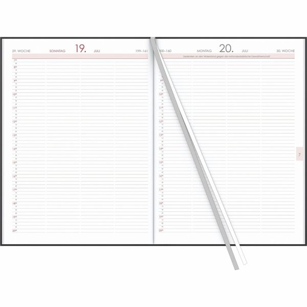 Kalendertyp: Buchkalender Typ 886 Übersichtliches Kalendarium: 1 Tag pro Seite mit 4 Spalten, hervorgehobenen Sonn- und Feiertagen, Wochen- und Zinstagezählung Detaillierte Planung: Viertelstundeneinteilung von 7:30 20 Uhr für präzise Terminorganisation Praktische Details: Zwei Lesezeichenbänder und Eckperforation zum schnellen Finden der aktuellen Seite Zusatzinformationen: Mit Telefon-/Adressverzeichnis, Ferienterminen, Feiertagen, Postentgelten und weiteren Infos Hochwertige Verarbeitung: 416 Seiten, fadengesiegelt für hohe Stabilität, hergestellt in Deutschland Nachhaltig produziert: FSC-zertifiziertes Papier Format & Ausstattung: 21 × 29,7 cm (DIN A4), wattierter anthrazitfarbener Kunststoffeinband