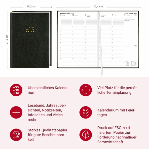 - Edle Organisationshilfe im klassischen Design: Buchkalender 2026 mit übersichtlicher Aufteilung und viel Platz für Eintragungen- Bringt Struktur in den Alltag: Neutraler Kalender im schwarzen Kunstleder-Einband mit praktischen Infos im Format A5- Agenda-Setting mit einer Prise Inspiration: schlichter Terminplaner mit berühmten Zitaten und Weisheiten- Alle Termine im Griff: Kalenderbuch mit Jahresübersichten, Schulferien und Adressenteil, Umfang 152 Seiten- Gut geplant durchs Jahr mit den Terminkalendern von Heye aus dem Athesa Kalenderverlag
