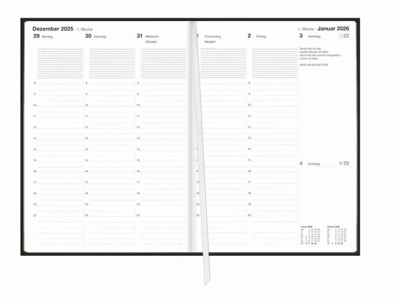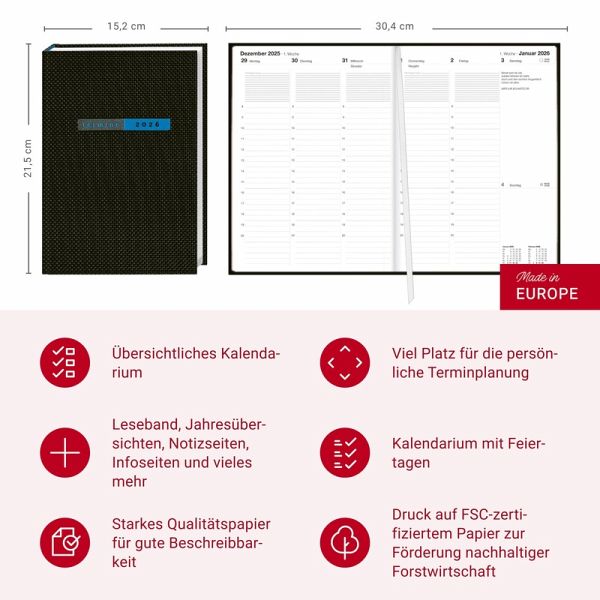 - Schicke Gedächtnisstütze in elegantem Schwarz: Der neue Terminplaner 2026- A5-Format mit reichlich Platz für alles, was wichtig ist: Die ganze Woche auf einen Blick im handlichen Terminkalender- Taschenplaner im stilvollen Design mit strukturiertem, schwarzen Einband: Ein praktischer Begleiter für Meetings und private Termine - Für alle, die viel vorhaben: Taschenkalender mit nützlichen Extras wie Lesebändchen, Jahresübersicht, Geburtstage, Vorschau auf 2026, To-do-Listen und vielem mehr- Terminplanung auf die klassische Art: Buchkalender von Heye aus dem Athesia Kalenderverlag