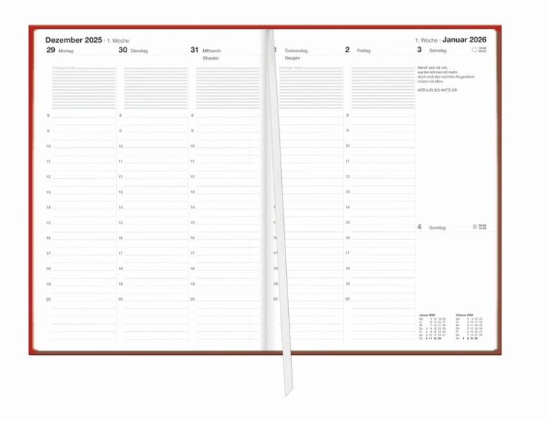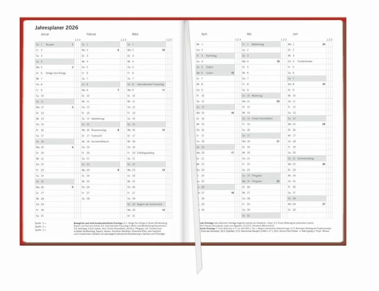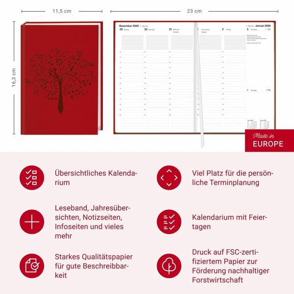 - Der klassische Taschenplaner für alles, was ansteht: Das rote Kalenderbuch 2026- A6 Format für den perfekten Überblick: Taschenkalender mit einer Seite Platz pro Woche- Lenkt den Blick auf das Wesentliche: der Cheftimer mit inspirierenden Zitaten und viel Raum für Eintragungen- Termine und To-dos im praktischen Planer für Schreibtisch, Handtasche und Rucksack- Wochenplaner mit Stil: Die Buchkalender von Heye aus dem Athesia Kalenderverlag