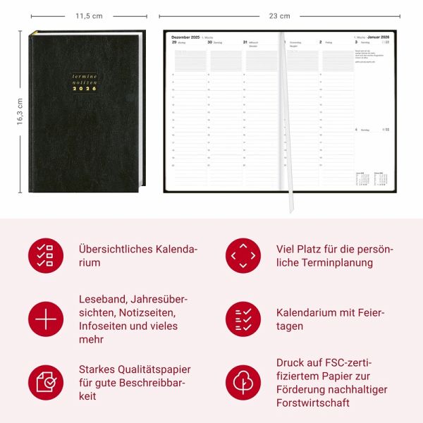 - Premium-Taschenplaner für alles, was ansteht: Das schwarze Kalenderbuch 2026 mit Einband aus Kunstleder- A6 Format für den perfekten Überblick: Taschenkalender mit einer Seite Platz pro Woche- Lenkt den Blick auf das Wesentliche: Cheftimer mit inspirierenden Zitaten und viel Raum für Eintragungen- Termine und To-dos im praktischen Planer für Schreibtisch, Handtasche und Rucksack- Wochenplaner mit Stil: Die Buchkalender von Heye aus dem Athesia Kalenderverlag