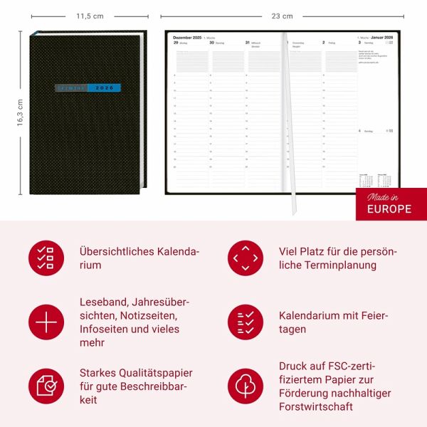 - Schlichter Taschenplaner für alles, was ansteht: Das schwarze Kalenderbuch 2026- Format A6 für den perfekten Überblick: Taschenkalender mit einer Seite Platz pro Woche- Lenkt den Blick auf das Wesentliche: der Cheftimer mit inspirierenden Zitaten und viel Raum für Eintragungen- Termine und To-dos im praktischen Planer für Schreibtisch, Handtasche und Rucksack- Wochenplaner mit Stil: Die Buchkalender von Heye aus dem Athesia Kalenderverlag
