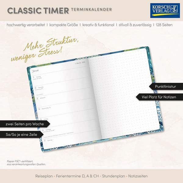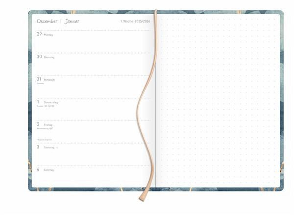 Buchkalender im Format 13 x 18,5 cm, 128 Seiten, nachhaltig produziertes, umweltfreundliches PapierKalendarium auf Deutsch für 12 MonatePraktische Wochenübersicht; Jede Kalenderwoche übersichtlich auf einer DoppelseiteFeiertage und Ferienzeiten für Deutschland, Österreich und SchweizNotizseite mit dotted Design im Bullet-Journal-LookRobustes, super-flexibles Cover mit Gummi- und Leseband