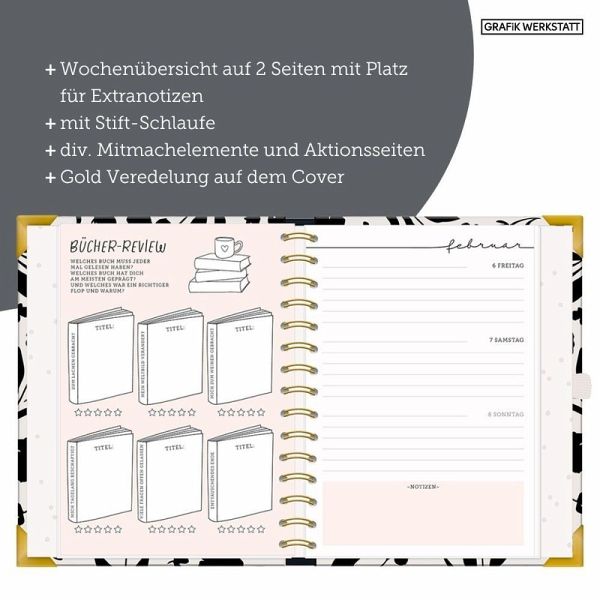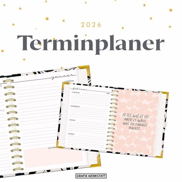 Dieser Terminplaner ist ein absolutes Multitalent und bezaubert durch sein besonders elegantes Design. Jede Kalenderwoche wird übersichtlich auf einer Doppelseite dargestellt und das Verschlussgummi hält Zettel, Quittungen und Notizen immer fest zusammen. Eine Stift-Schlaufe, Falttasche und ein Satin-Lesezeichenband sorgen zusätzlich für Ordnung. Dekorative Goldkappen an den Cover-Ecken verhindern die vorzeitige Abnutzung. Diverse Mitmach-Elemente und Aktionsseiten wie To-Do-Listen, Geburtstagskalender und Rezeptseiten sorgen für gute Laune und machen diesen Kalender zu einem echten Premium-Planer. Dank einer Jahres- & Monatsvorschau auf einer Seite lässt sich das Jahr 2026 optimal planen.