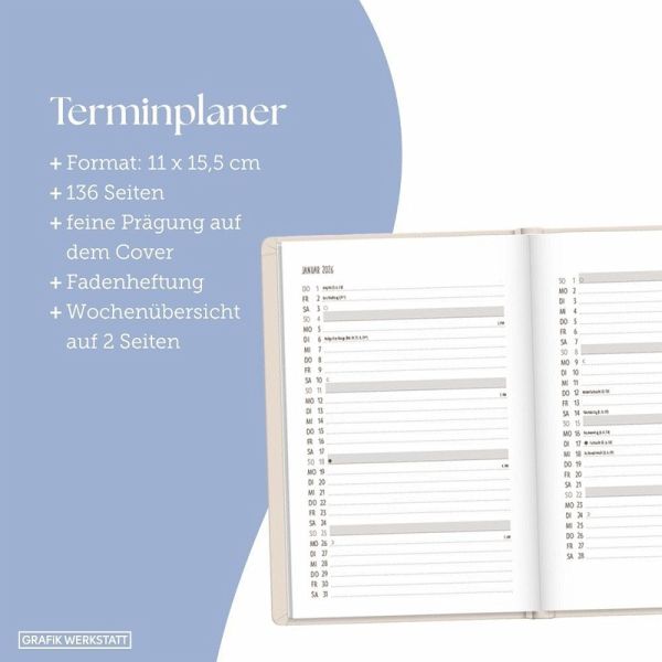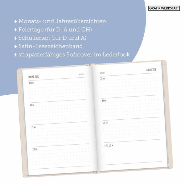 Mit diesem kleinen Terminplaner kannst du das Jahr 2026 strukturiert und einfach planen. Dank der Wochenübersicht auf einer Doppelseite, viel Platz für Notizen und einem Satin-Lesezeichen verlierst du niemals den Überblick. Eine Jahres- & Monatsvorschau auf einer Seite bietet dir die Möglichkeit das Jahr 2026 optimal zu planen.