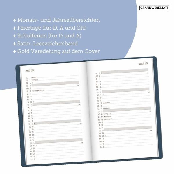 Mit diesem kleinen Terminplaner kannst du das Jahr 2026 strukturiert und einfach planen. Dank der Wochenübersicht auf einer Doppelseite, viel Platz für Notizen und einem Satin-Lesezeichen verlierst du niemals den Überblick. Eine Jahres- & Monatsvorschau auf einer Seite bietet dir die Möglichkeit das Jahr 2026 optimal zu planen.