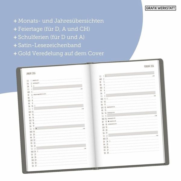 Mit diesem kleinen Terminplaner kannst du das Jahr 2026 strukturiert und einfach planen. Dank der Wochenübersicht auf einer Doppelseite, viel Platz für Notizen und einem Satin-Lesezeichen verlierst du niemals den Überblick. Eine Jahres- & Monatsvorschau auf einer Seite bietet dir die Möglichkeit das Jahr 2026 optimal zu planen.