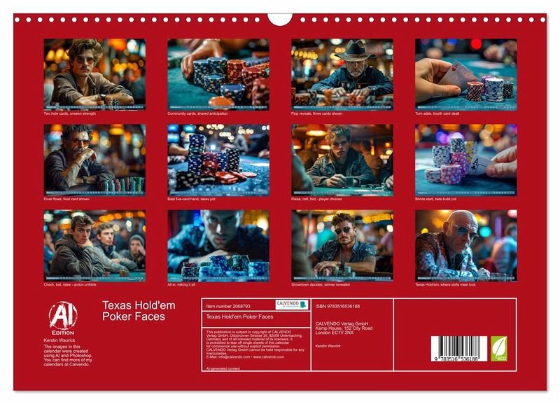 QUALITY - High-quality photo calendar with 12 beautiful images on light-resistant paper, robust spiral binding with hanger.SUSTAINABLE - Significant waste reduction due to print-on-demand production, environmentally friendly FSC-certified paper, produced in the UK, climate-consciouslogistical processes.PERFECT GIFT - calendars for friends and family, for children, all ages and all occasions, from Christmas to birthdays and everything in between.LOTS OF CHOICE - Wall calendars in different sizes (DIN A4 and DIN A3), for any topic and personal taste, featuring photography, painting and illustrations.A journey through the art of poker in Las Vegas, author: Kerstin Waurick