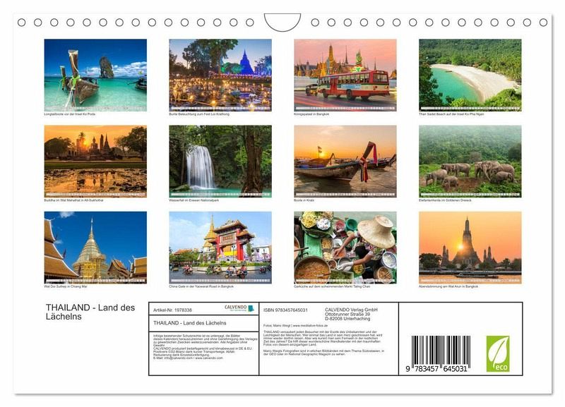 THAILAND verzaubert jeden Besucher mit der Exotik des Unbekannten und der Leichtigkeit der Menschen. Wer einmal das Land in sein Herz geschlossen hat, wird immer wieder dorthin reisen. Aber wie kuriert man sein Fernweh in der restlichen Zeit des Jahres? Da hilft dieser wunderschöne Wandkalender mit den traumhaften Bildern von diesem einzigartigen Land.
