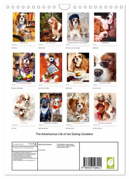 QUALITY - High-quality photo calendar with 12 beautiful images on light-resistant paper, robust spiral binding with hanger.SUSTAINABLE - Significant waste reduction due to print-on-demand production, environmentally friendly FSC-certified paper, produced in the UK, climate-conscious logistical processes.PERFECT GIFT - calendars for friends and family, for children, all ages and all occasions, from Christmas to birthdays and everything in between.LOTS OF CHOICE - Wall calendars in different sizes (DIN A4 and DIN A3), for any topic and personal taste, featuring photography, painting and illustrations.Two charming Cavaliers bring joy to dog lovers daily, author: Eva Feix