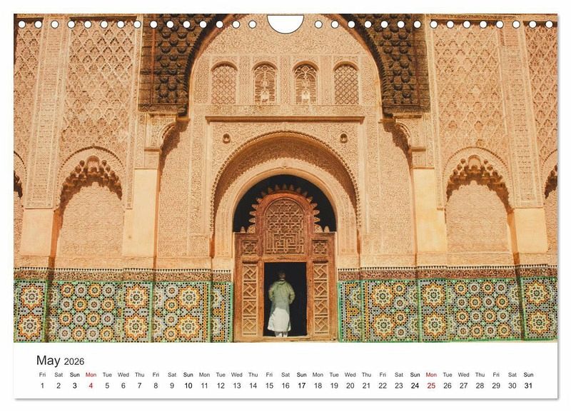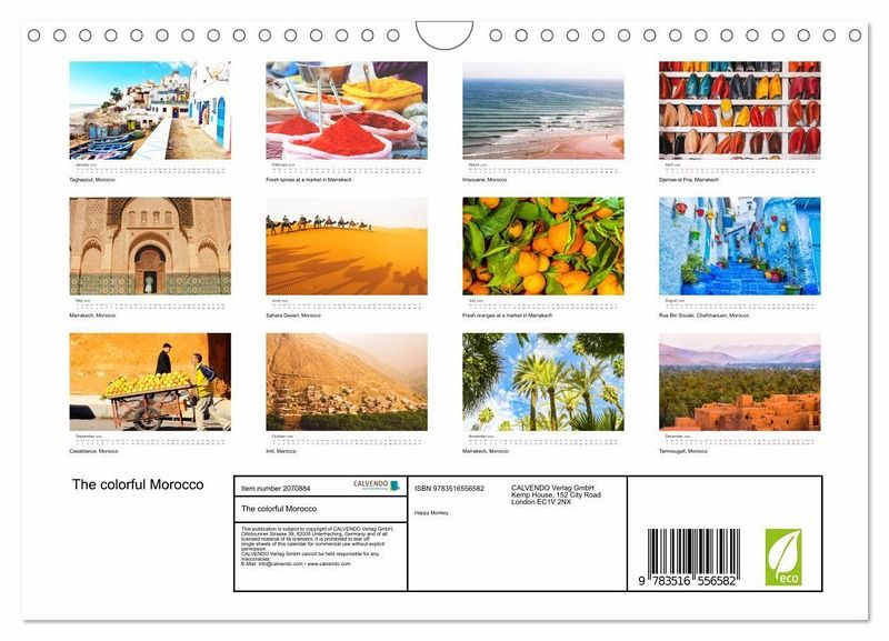QUALITY - High-quality photo calendar with 12 beautiful images on light-resistant paper, robust spiral binding with hanger.SUSTAINABLE - Significant waste reduction due to print-on-demand production, environmentally friendly FSC-certified paper, produced in the UK, climate-conscious logistical processes.PERFECT GIFT - calendars for friends and family, for children, all ages and all occasions, from Christmas to birthdays and everything in between.LOTS OF CHOICE - Wall calendars in different sizes (DIN A4 and DIN A3), for any topic and personal taste, featuring photography, painting and illustrations.Morocco - the oasis for all senses, author: Happy Monkey