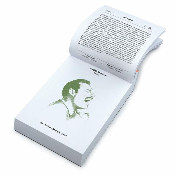 365 Todestage, 365 Todesarten, 365 spannend erzählte Biografien. Gute Geschichten entbehren zuweilen nicht einer gewissen Tragik. Und was mutet tragischer an als ein viel zu früher Tod? Der kurzweilige Tageskalender spielt mit der Faszination für tragische, mitunter aberwitzige Todesfälle. An jedem Tag im Jahr erzählt der Abreisskalender die inspirierende Lebensgeschichte einer zu jung gestorbenen Ikone. Ob James Dean, Jeanne d'Arc oder Friedrich Schiller - das plötzliche Ableben dieser Helden erschüttert die Nachwelt. Die Protagonisten sind Pioniere ihres Fachs, wahre Genies, mutige Erfinder, gefeierte Stars, gefallene Helden, tapfere Kämpfer, verarmte Denker, außergewöhnliche Sportskanonen und musikalische Ausnahmetalente. Ein illustrer Kreis aus wahren Legenden, die in jungen Jahren Großes leisten und die Grenzen ihrer Zeit verschieben.