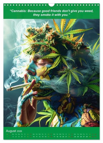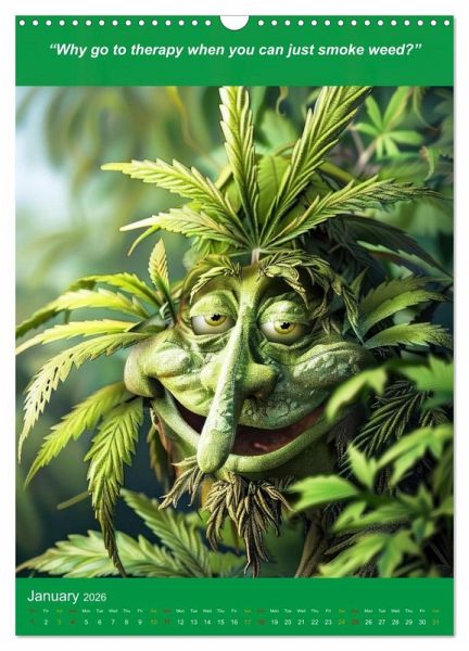 Discover the ultimate annual calendar for cannabis enthusiasts. With exclusive, AI generated motifs that depict the colorful and diverse world of cannabis in a humorous light, this calendar is an absolute must have. Each month surprises with a unique, funny motif that is guaranteed to put a smile on your face. To match, you'll find inspiring and witty sayings that capture the essence of the cannabis lifestyle. From relaxed vibes to profound thoughts about the plant that is so much more than just an intoxicant, this calendar celebrates the creativity and joy that cannabis brings to our lives. Perfect for your own wall or as an original gift for friends who love the green stuff.