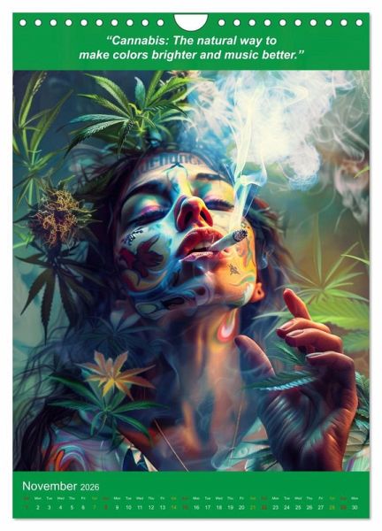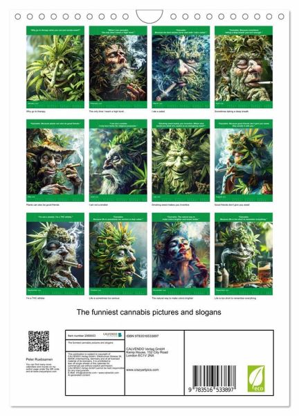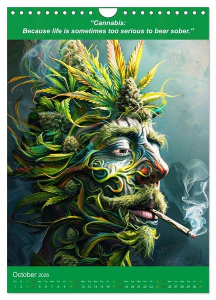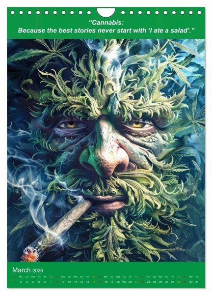 QUALITY - High-quality photo calendar with 12 beautiful images on light-resistant paper, robust spiral binding with hanger.SUSTAINABLE - Significant waste reduction due to print-on-demand production, environmentally friendly FSC-certified paper, produced in the UK, climate-conscious logistical processes.PERFECT GIFT - calendars for friends and family, for children, all ages and all occasions, from Christmas to birthdays and everything in between.LOTS OF CHOICE - Wall calendars in different sizes (DIN A4 and DIN A3), for any topic and personal taste, featuring photography, painting and illustrations.A must have for cannabis lovers, author: Peter Rübsamen