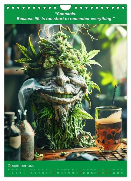 Discover the ultimate annual calendar for cannabis enthusiasts. With exclusive, AI generated motifs that depict the colorful and diverse world of cannabis in a humorous light, this calendar is an absolute must have. Each month surprises with a unique, funny motif that is guaranteed to put a smile on your face. To match, you'll find inspiring and witty sayings that capture the essence of the cannabis lifestyle. From relaxed vibes to profound thoughts about the plant that is so much more than just an intoxicant, this calendar celebrates the creativity and joy that cannabis brings to our lives. Perfect for your own wall or as an original gift for friends who love the green stuff.