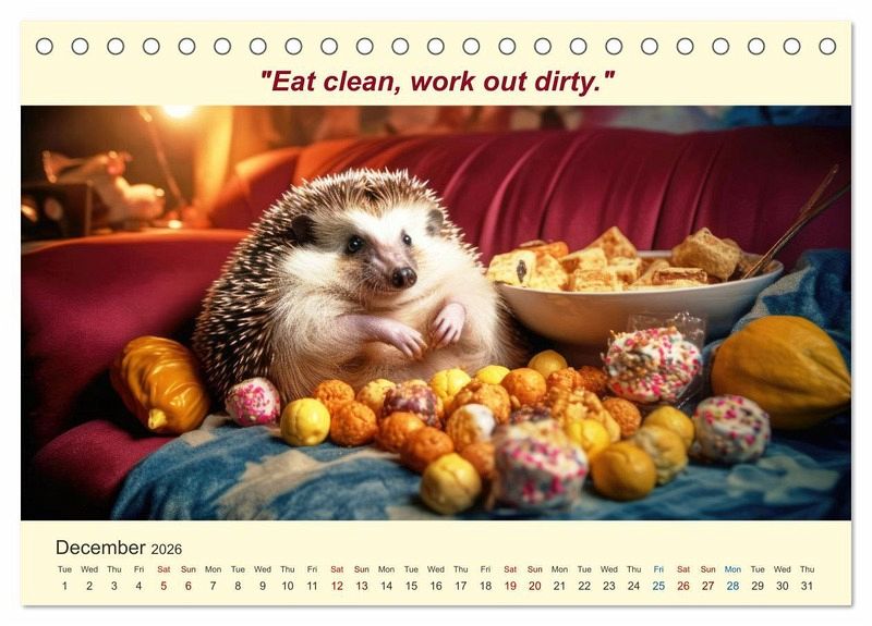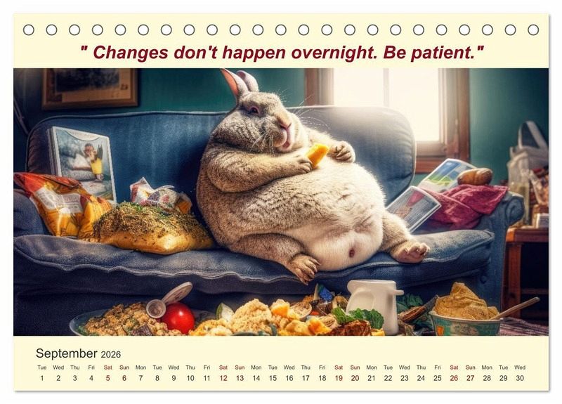 Discover the ultimate motivational boost for your weight loss goal. Our unique calendar will accompany you through the year with a smile. Each month you'll find a humorous saying paired with an irresistibly funny animal picture that will inspire you to tackle your fitness goals with joy. Forget boring diet plans and monotonous workouts. With our AI generated calendar, every weight loss becomes a fun challenge. Get motivated month after month, stick to your goals and enjoy the journey to a healthier you. With our calendar by your side, every day will be a step full of joy and laughter on your journey to your desired weight. Get your companion now for a year full of motivation and fun.