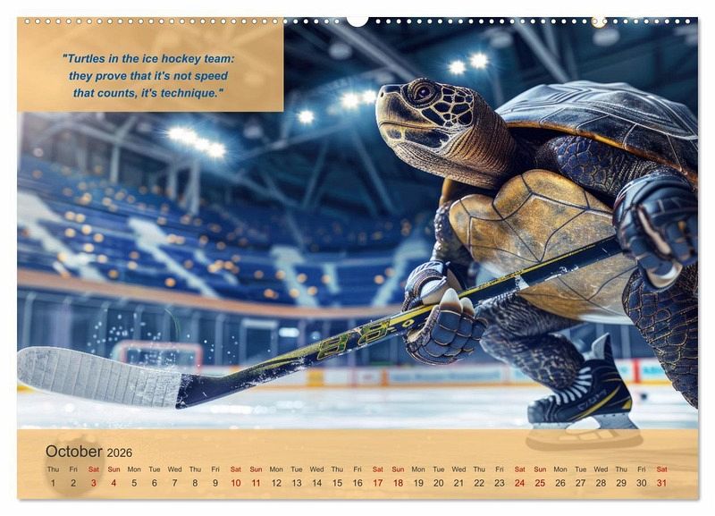 Dive into the year with a snapshot of joy and a dash of humor with our exclusive charming ice hockey animals in action annual calendar. Each month unveils a delightful scene of furry athletes on the ice, from determined dogs defending the goal to agile hedgehogs acing the puck, all captured in whimsical ice hockey positions. Paired with each AI generated image are funny and humorous quotes that perfectly encapsulate the spirit of the game and the personality of our four legged friends. This calendar is not just a way to track the days, it's a daily reminder to embrace fun, laughter, and the love of ice hockey. Perfect for fans of all ages, it's the ideal gift to light up faces and warm hearts throughout the seasons.