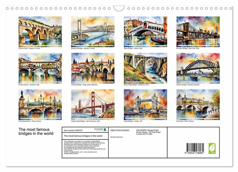 QUALITY - High-quality photo calendar with 12 beautiful images on light-resistant paper, robust spiral binding with hanger.SUSTAINABLE - Significant waste reduction due to print-on-demand production, environmentally friendly FSC-certified paper, produced in the UK, climate-conscious logistical processes.PERFECT GIFT - calendars for friends and family, for children, all ages and all occasions, from Christmas tobirthdays and everything in between.LOTS OF CHOICE - Wall calendars in different sizes (DIN A4 and DIN A3), for any topic and personal taste, featuring photography, painting and illustrations.Enchanting watercolours of the highest art of engineering from different eras, author: Claudia Kleemann