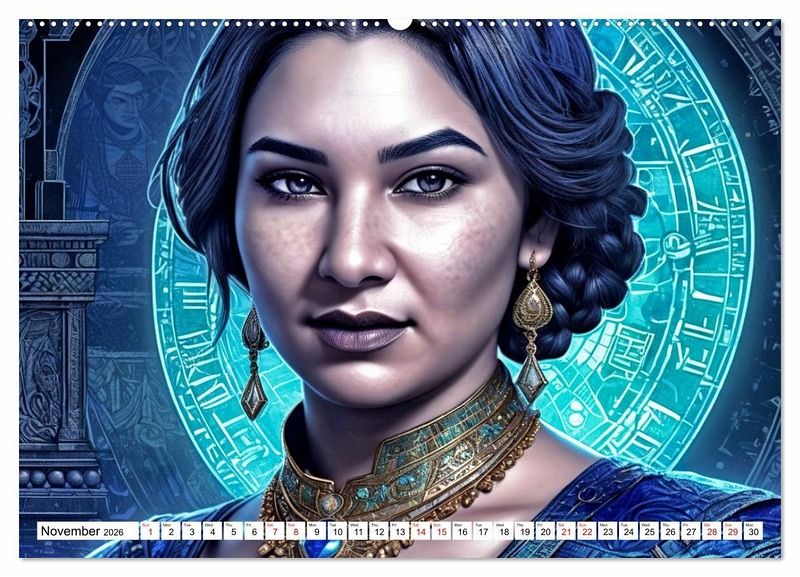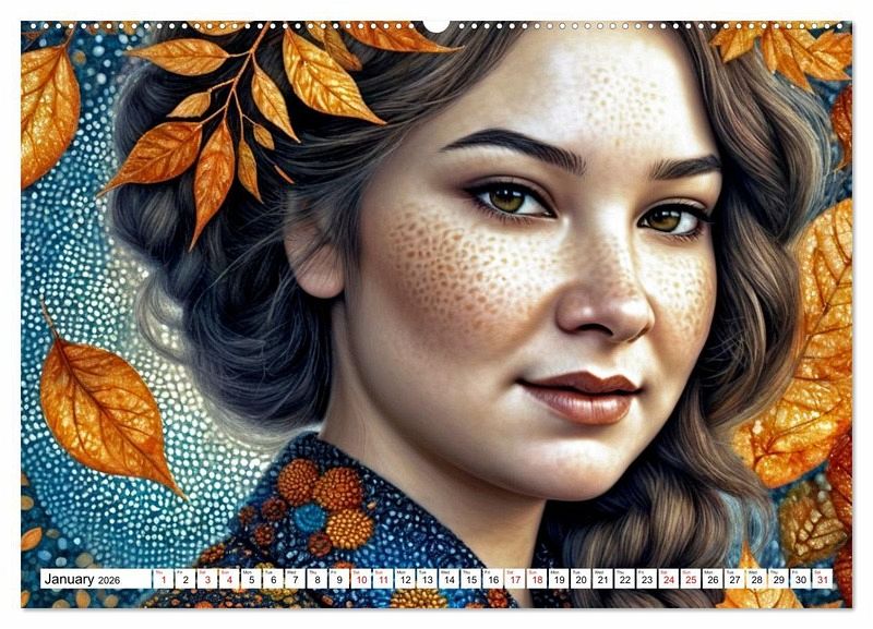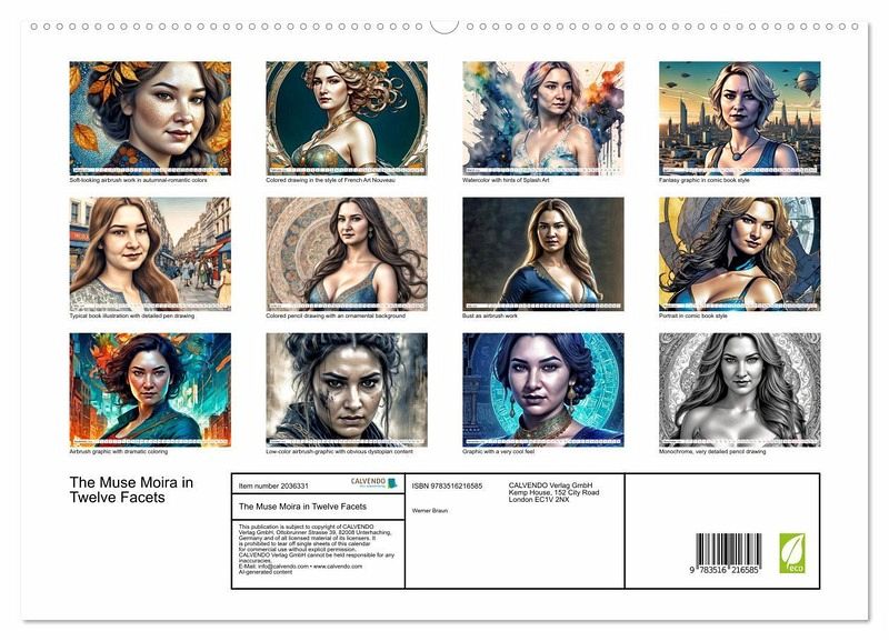 Thanks to artificial intelligence, you will get to know Moira, a virtual muse who presents herself in images of various artistic styles. Moira's pretty face is shown to us as an airbrush graphic with a dystopian feel, as well as a very detailed pencil drawing with ornamental decor, as a book illustration, and also as a comic strip graphic. Our calendar reveals a new facet of Moira and her artistic transformation each month. With this calendar, you will also receive a tribute to the infinite creativity that arises from the connection between human imagination and artificial intelligence. Let Moira's charm inspire you for an entire year.