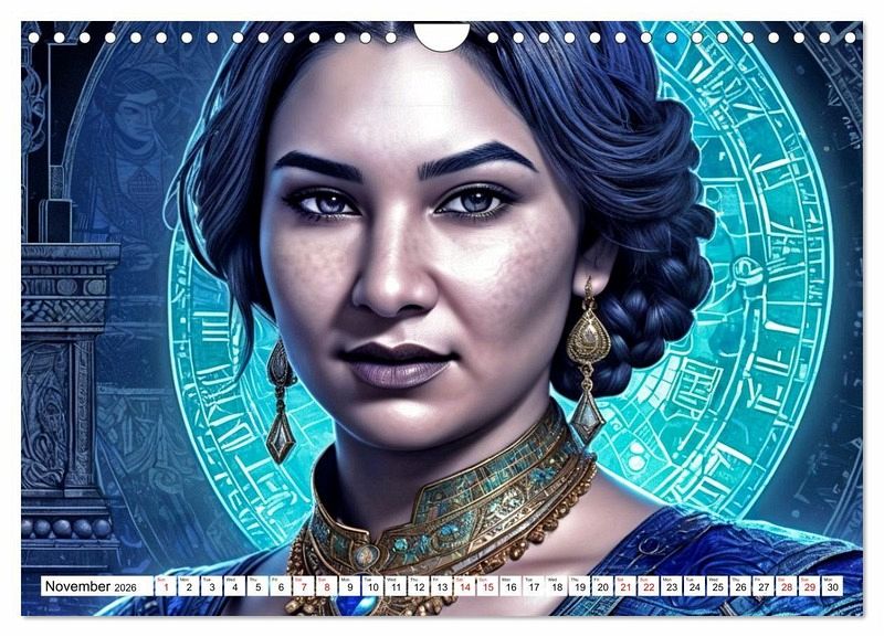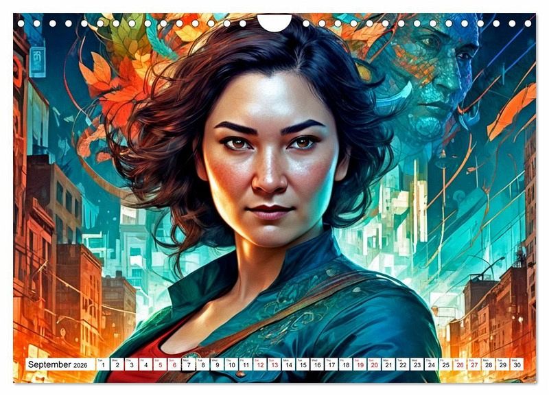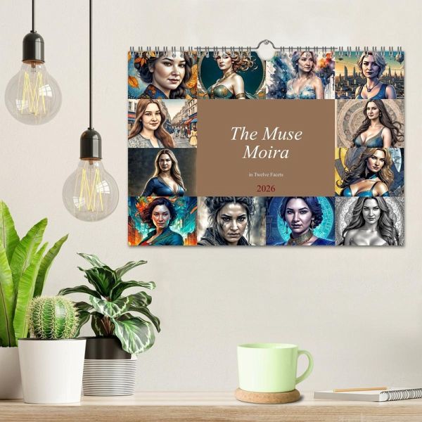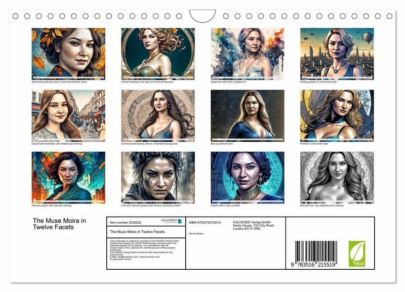 Thanks to artificial intelligence, you will get to know Moira, a virtual muse who presents herself in images of various artistic styles. Moira's pretty face is shown to us as an airbrush graphic with a dystopian feel, as well as a very detailed pencil drawing with ornamental decor, as a book illustration, and also as a comic strip graphic. Our calendar reveals a new facet of Moira and her artistic transformation each month. With this calendar, you will also receive a tribute to the infinite creativity that arises from the connection between human imagination and artificial intelligence. Let Moira's charm inspire you for an entire year.