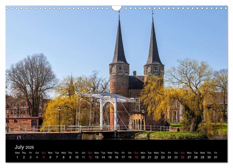 The Netherlands are a country of windmills and canals. The capital, Amsterdam, is famous for its waterways and its laid-back atmosphere. The Hague is home to the queen and a center for international diplomacy. In this calendar you may also discover cities full of character like Delft, Leiden, Utrecht and Rotterdam.