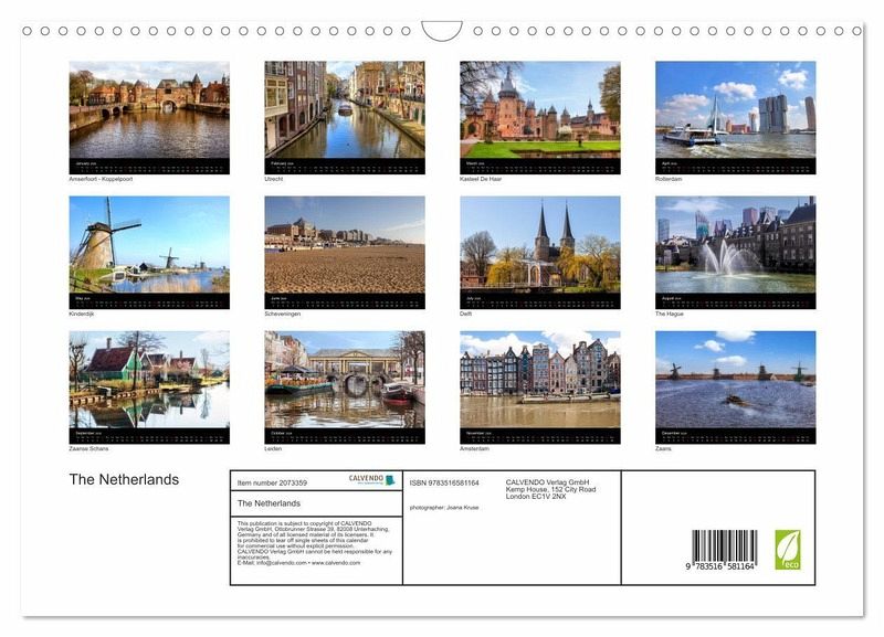 QUALITY - High-quality photo calendar with 12 beautiful images on light-resistant paper, robust spiral binding with hanger.SUSTAINABLE - Significant waste reduction due to print-on-demand production, environmentally friendly FSC-certified paper, produced in the UK, climate-conscious logistical processes.PERFECT GIFT - calendars for friends and family, for children, all ages and all occasions, from Christmas to birthdays and everything in between.LOTS OF CHOICE - Wall calendars in different sizes (DIN A4 and DIN A3), for any topic and personal taste, featuring photography, painting and illustrations.The Netherlands - a country between wind and water., author: Joana Kruse