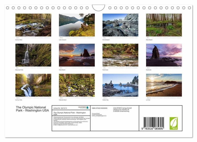 Der US-Staat Washington hat neben den National Parks Mount Rainier und North Cascades den wohl urwaldigsten Park: Den Olympic National Park. Thomas Klinder durfte diesen Park durchkreuzen und zeigt in diesem Kalender die Vielfalt des Parks, der sehr attraktiv am Pazifik liegt. Natur pur mit vielen Facetten.