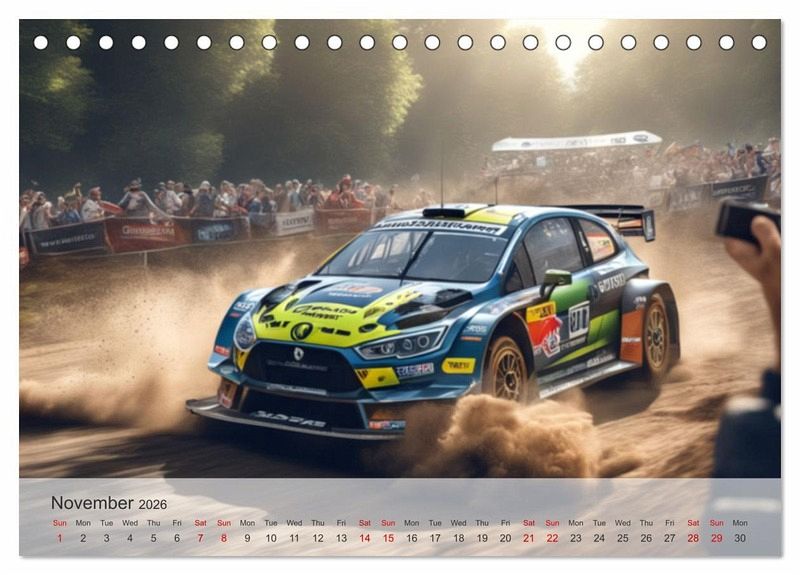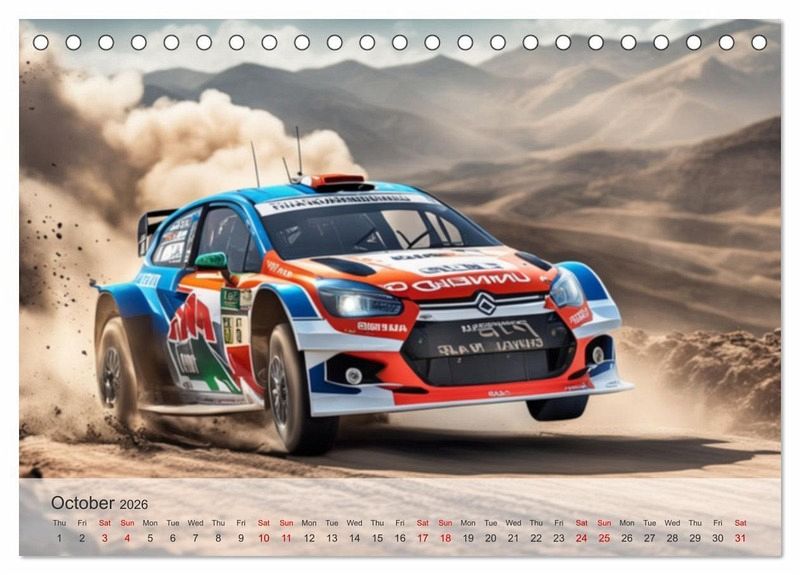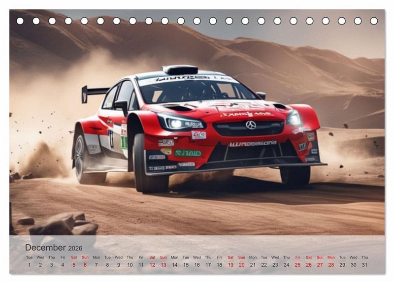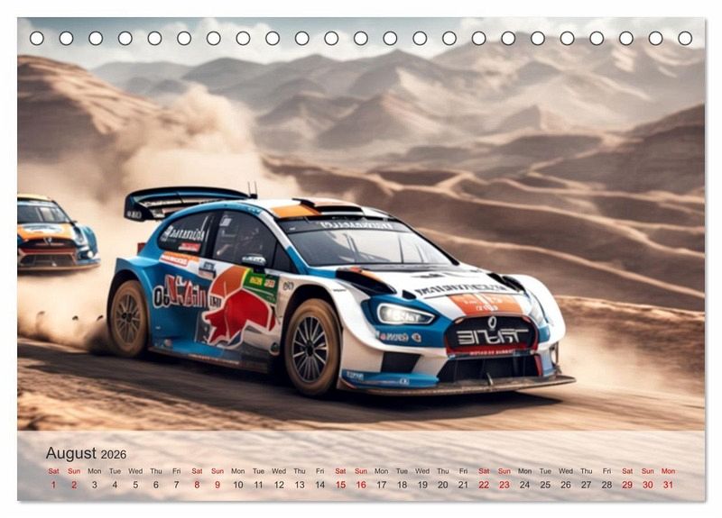 QUALITY - High-quality photo calendar with 12 beautiful images on light-resistant paper, robust spiral binding.SUSTAINABLE - Significant waste reduction due to print-on-demand production, environmentally friendly FSC-certified paper, produced locally, climate-conscious logistical processes.PERFECT GIFT - calendars for friends and family, for children, all ages and all occasions, from Christmas to birthdays and everything in between.LOTS OF CHOICE - Wall calendars in different sizes (DIN A4 and DIN A3), for any topic and personal taste, featuring photography, painting and illustrations.Experience the ultimate sports driving experience with our AI-created rally cars. von Autor(in): Jérôme