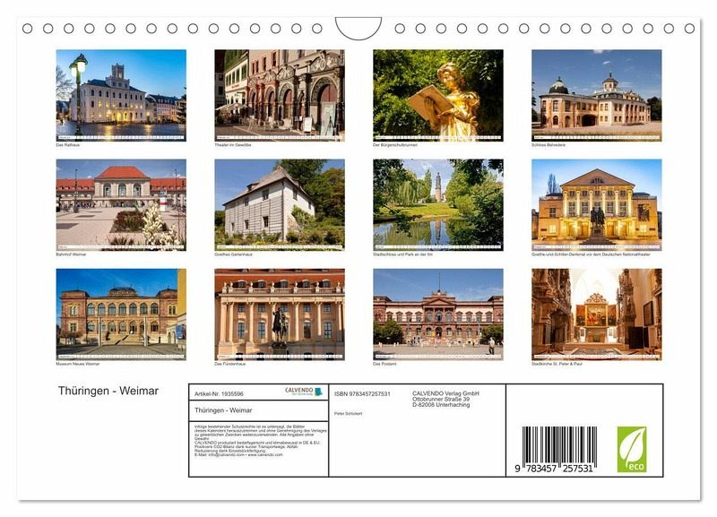 QUALITÄT - Hochwertiger Fotokalender mit 12 wunderschönen Motiven auf lichtbeständigem Bilderdruckpapier, robuste Spiralbindung mit Aufhängebügel.NACHHALTIG - deutliche Abfallreduzierung durch bedarfsgerechte Einzelstückfertigung, umweltfreundliches FSC-zertifiziertes Papier, Produktion in Deutschland, klimabewusste Logistik.PERFEKTES GESCHENK - Kalender für Freunde und Familie, für Kinder und Erwachsene, jung und alt, zu Weihnachten, Geburtstag oder zwischendurch.VIELFALT - Bildkalender in verschiedenen Formaten, z.B. DIN A5, DIN A4, DIN A3 sowie DIN A2. Ob Naturmotiv, Gemälde oder Fotos, ideal für ein persönliches Wohlfühlambiente.12 Monate mit der wunderbaren Stadt Weimar in Thüringen - die Stadt der Dichter und Denker. Höhepunkte im sehenswerten Bundesland Thüringen. von Autor(in): Peter Schickert
