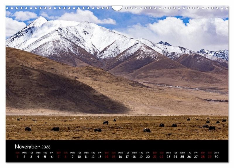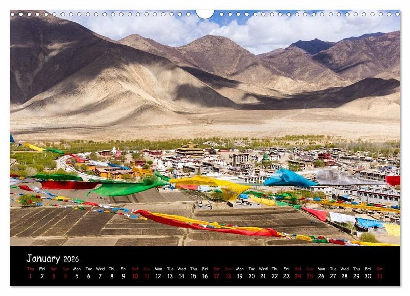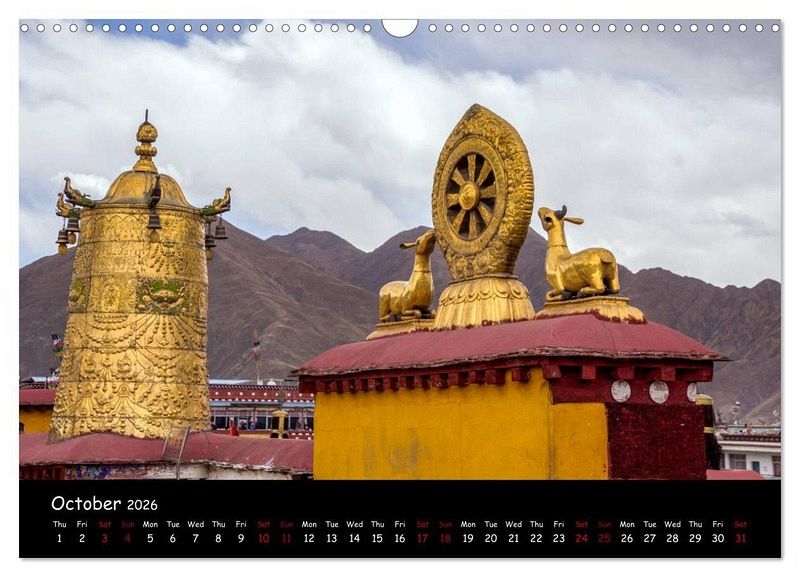 Known around the globe as the "Roof of the World", Tibet is a place of natural wonders. Frozen peaks and windy flatlands constitute the landscape of this high desert plateau. This spectacular Himalayan country is steeped with fortresses and temples, shrouded in legend and traditional Buddhist culture. With this calendar, stroll through a selection of Tibetan landscapes, monasteries and other Tibetan landmarks.
