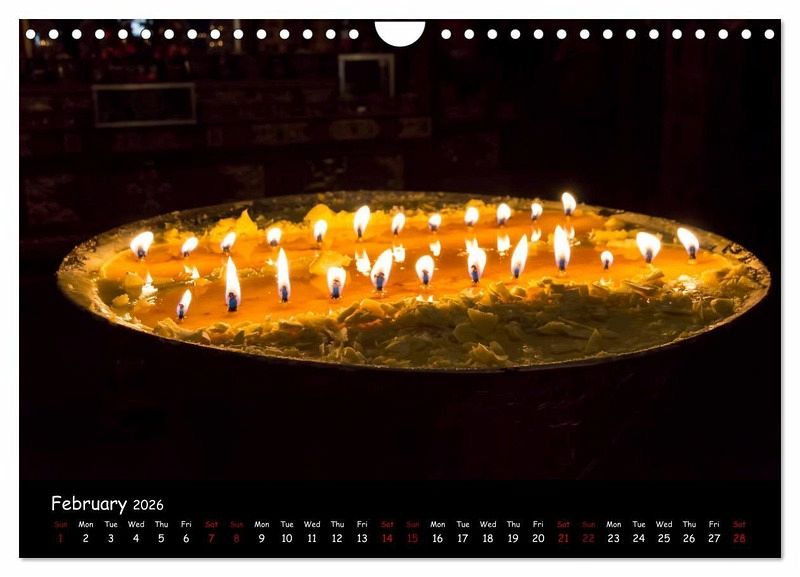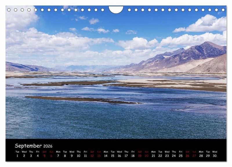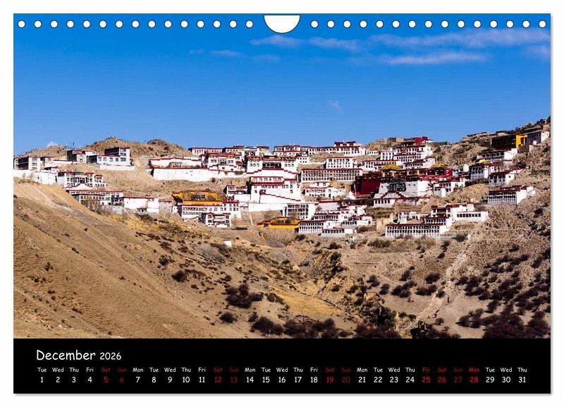 Known around the globe as the "Roof of the World", Tibet is a place of natural wonders. Frozen peaks and windy flatlands constitute the landscape of this high desert plateau. This spectacular Himalayan country is steeped with fortresses and temples, shrouded in legend and traditional Buddhist culture. With this calendar, stroll through a selection of Tibetan landscapes, monasteries and other Tibetan landmarks.