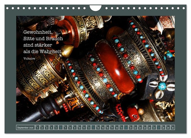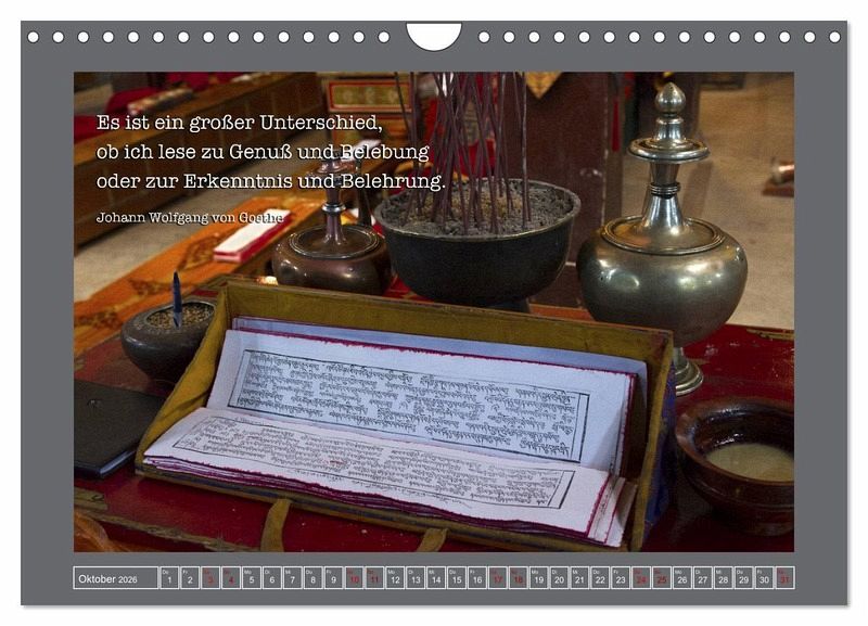 Dieser Kalender zeigt Fotos aus allen Teilen des historischen Tibets (Kham, Amdo, Ü, Tsang, Ngari) in Verbindung mit einem zu dem Bild passenden Sinnspruch.