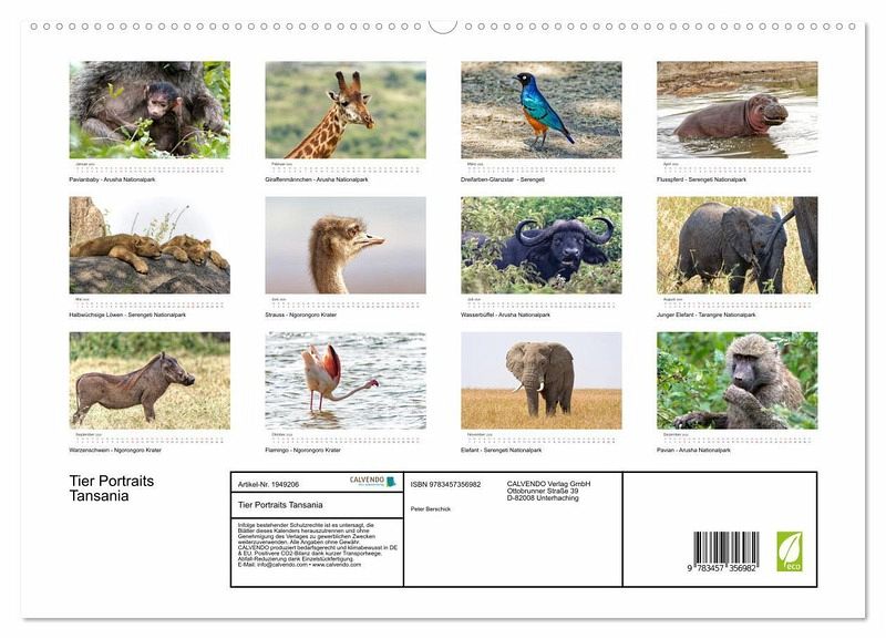 PREMIUM-LINIE - Brillanter Fotokalender mit 12 wunderschönen Motiven, Kunstdruck in Hochglanz in Museumsqualität.QUALITÄT - edle Materialien, stabile Rückwand mit 2 innovativen Einstecktaschen für eine optimale Präsentation an der Wand.NACHHALTIG - deutliche Abfallreduzierung durch bedarfsgerechte Einzelstückfertigung, umweltfreundliches FSC-zertifiziertes Papier, Produktion in Deutschland, klimabewusste Logistik.PERFEKTES GESCHENK - Kalender für Freunde und Familie, für Kinder und Erwachsene, jung und alt, zu Weihnachten, Geburtstag oder zwischendurch.Die Schönheit und Einzigartigkeit der Tierwelt Tansanias eingefangen in ausdrucksstarken Bildern von Autor(in): Peter Berschick