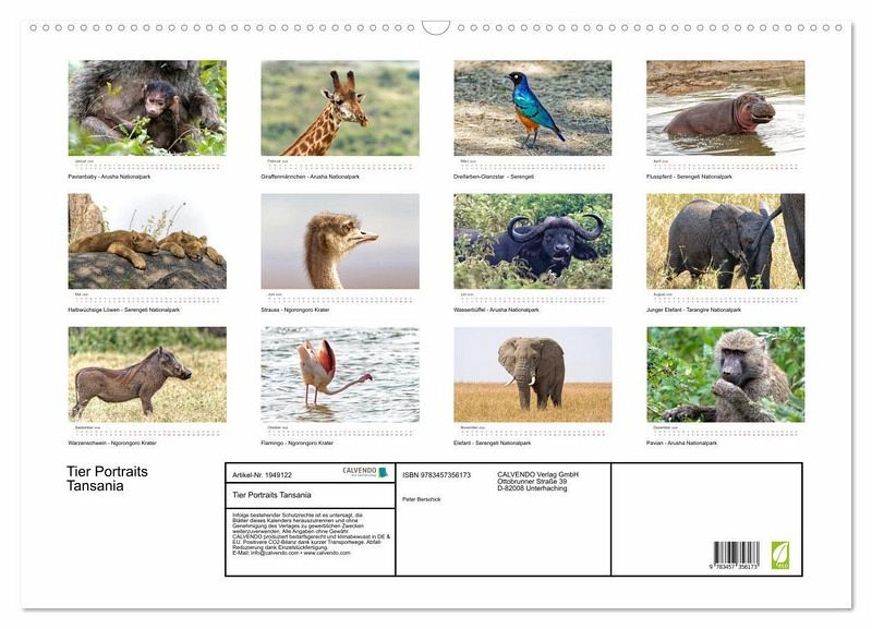 QUALITÄT - Hochwertiger Fotokalender mit 12 wunderschönen Motiven auf lichtbeständigem Bilderdruckpapier, robuste Spiralbindung mit Aufhängebügel.NACHHALTIG - deutliche Abfallreduzierung durch bedarfsgerechte Einzelstückfertigung, umweltfreundliches FSC-zertifiziertes Papier, Produktion in Deutschland, klimabewusste Logistik.PERFEKTES GESCHENK - Kalender für Freunde und Familie, für Kinder und Erwachsene, jung und alt, zu Weihnachten, Geburtstag oder zwischendurch.VIELFALT - Bildkalender in verschiedenen Formaten, z.B. DIN A5, DIN A4, DIN A3 sowie DIN A2. Ob Naturmotiv, Gemälde oder Fotos, ideal für ein persönliches Wohlfühlambiente.Die Schönheit und Einzigartigkeit der Tierwelt Tansanias eingefangen in ausdrucksstarken Bildern von Autor(in): Peter Berschick
