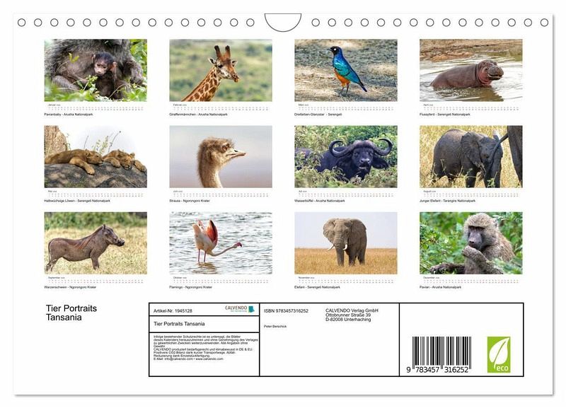 QUALITÄT - Hochwertiger Fotokalender mit 12 wunderschönen Motiven auf lichtbeständigem Bilderdruckpapier, robuste Spiralbindung mit Aufhängebügel.NACHHALTIG - deutliche Abfallreduzierung durch bedarfsgerechte Einzelstückfertigung, umweltfreundliches FSC-zertifiziertes Papier, Produktion in Deutschland, klimabewusste Logistik.PERFEKTES GESCHENK - Kalender für Freunde und Familie, für Kinder und Erwachsene, jung und alt, zu Weihnachten, Geburtstag oder zwischendurch.VIELFALT - Bildkalender in verschiedenen Formaten, z.B. DIN A5, DIN A4, DIN A3 sowie DIN A2. Ob Naturmotiv, Gemälde oder Fotos, ideal für ein persönliches Wohlfühlambiente.Die Schönheit und Einzigartigkeit der Tierwelt Tansanias eingefangen in ausdrucksstarken Bildern von Autor(in): Peter Berschick