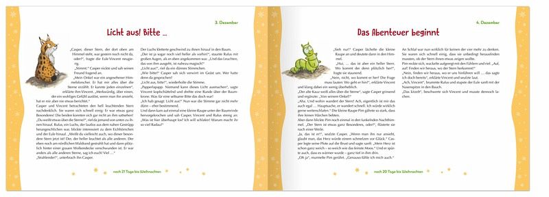 Jeden Tag im Advent gibt es ein weiteres Kapitel der Geschichte zum Lesen oder Vorlesen. Dazu kann der beigelegte große Sternenfächer um eine weitere Sternspitze erweitert werden und wächst so immer weiter an, bis er am 24. Dezember vollständig ist.