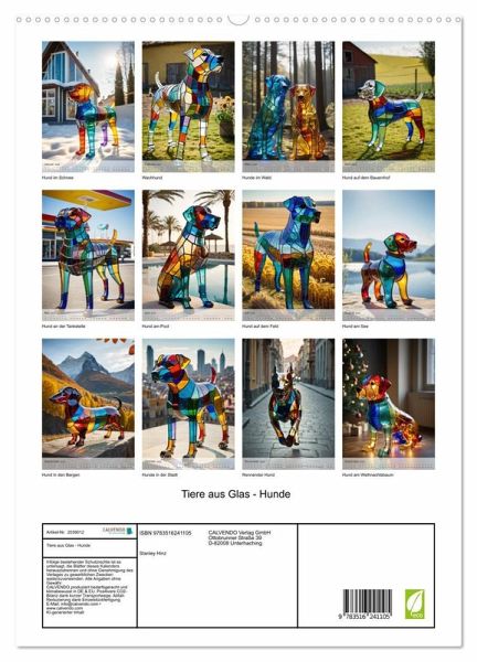 Entdecken Sie die außergewöhnliche Schönheit gläserner Kunstwerke mit dem Kalender "Tiere aus Glas - Hunde". Jede Kalenderseite präsentiert einen kunstvoll gestalteten Hund, dessen Design aus strahlend bunten Glaselementen besteht. Die detailreiche Gestaltung und die leuchtenden Farben machen jedes Motiv zu einem besonderen Hingucker. Monat für Monat erwartet Sie ein neues, bezauberndes KI generiertes Bild, das die Faszination von Glaskunst und Tierliebe vereint. Ein ideales Geschenk für Hundeliebhaber und alle, die das Außergewöhnliche suchen. Holen Sie sich diesen einzigartigen Kalender nach Hause und lassen Sie sich von seiner kunstvollen Eleganz begeistern!