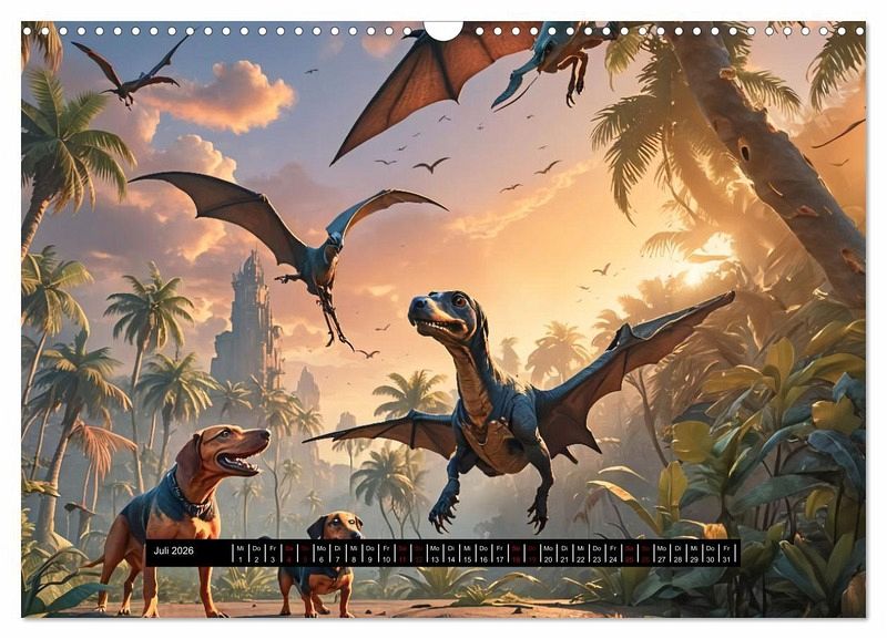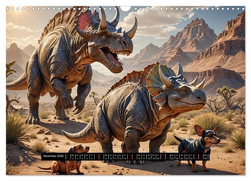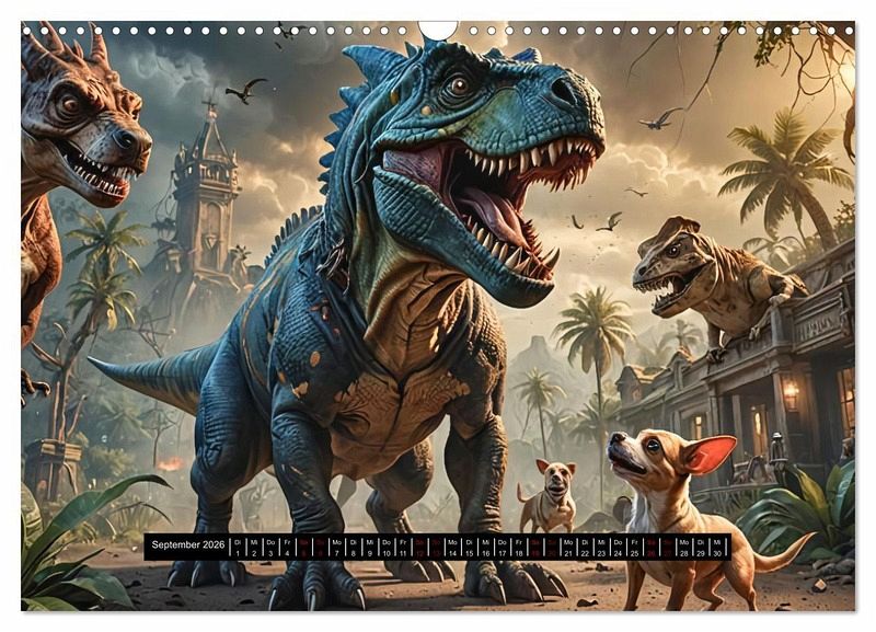 Dieser Kalender zeigt Tiere aus längst vergangenen Zeiten zusammen mit Tieren der heutigen Zeit. Verschiedene Dinosaurier treffen auf verschiedene beliebte Hunderassen. Alle Bilder wurden mit KI erstellt.