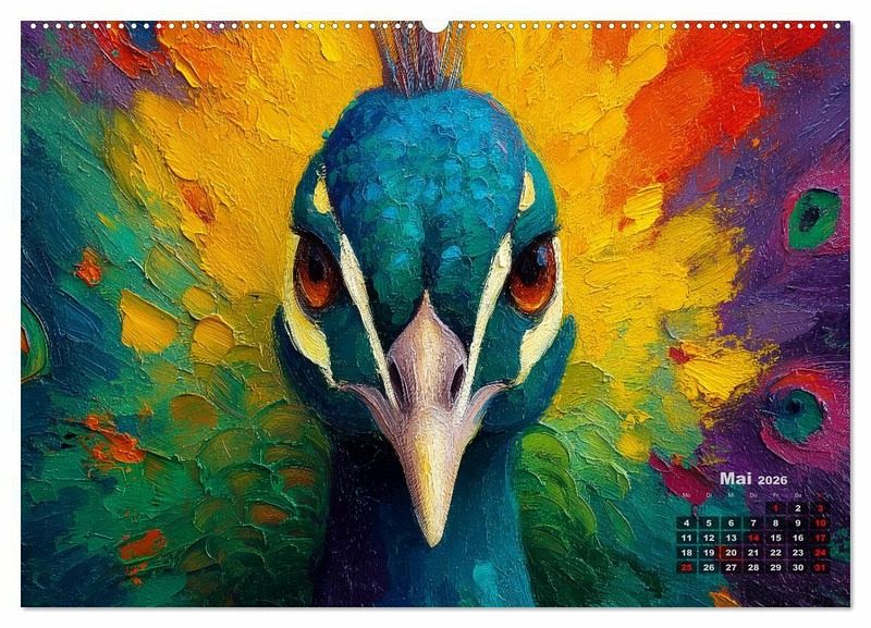Mai: Pfau Porträt - Farbenpracht Illustration