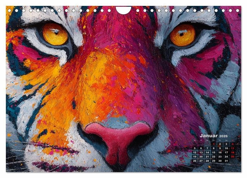 Erlebe die Schönheit der Tierwelt in ausdrucksstarken Porträts voller Farben und Details verschiedener Tiere. Jeder Monat zeigt ein kunstvolles Tierbild im Aquarell-Stil - von majestätischen Tigern bis zu farbenprächtigen Vögeln. Dieser Kunstkalender verbindet stilvolle Illustrationen mit praktischem Nutzen und bietet viel Platz für Termine und Notizen. Ob als dekorativer Familienkalender, kreativer Kinderkalender oder besonderes Geschenk für Tierliebhaber - hier trifft Kunst auf Natur. Die Tiere wurden mit moderner KI-Technik gestaltet und vereinen künstlerische Vielfalt mit leuchtender Farbintensität. Ein echter Blickfang, der jeden Raum bereichert und Tierporträts zu einem täglichen Erlebnis macht.