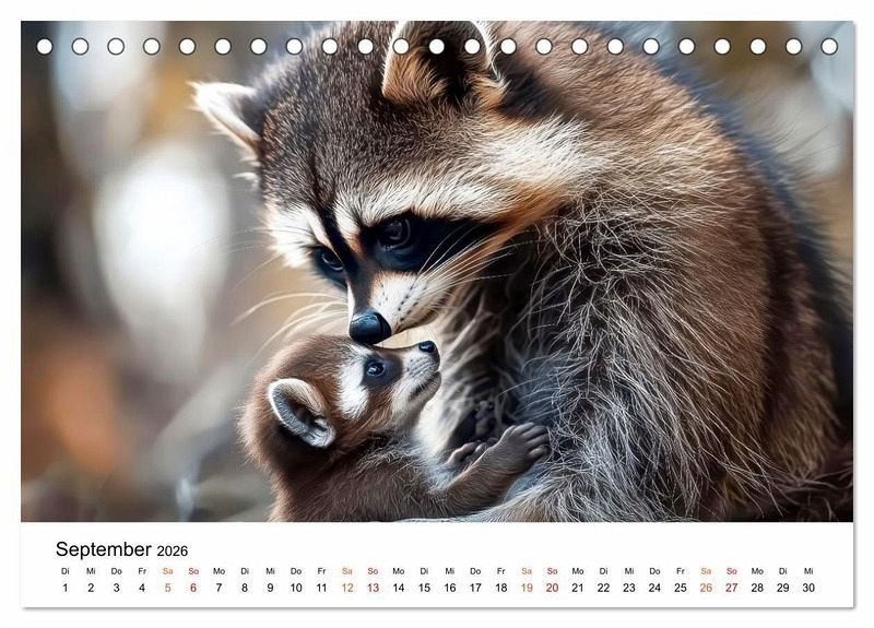 September: Eine Waschbärmutter, die ihr Junges zärtlich im Arm hält