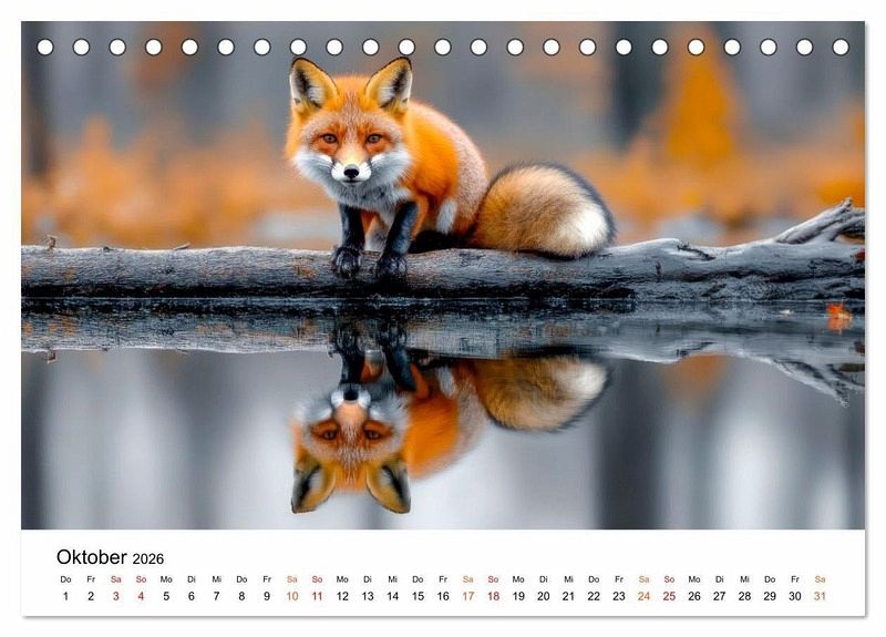 Oktober: Ein neugieriger Fuchs auf einem treibenden Baumstamm, umgeben von stillem Wasser
