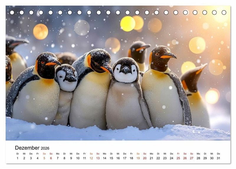 Dezember: Brütende Kaiserpinguine, eng aneinandergeschmiegt im antarktischen Schnee