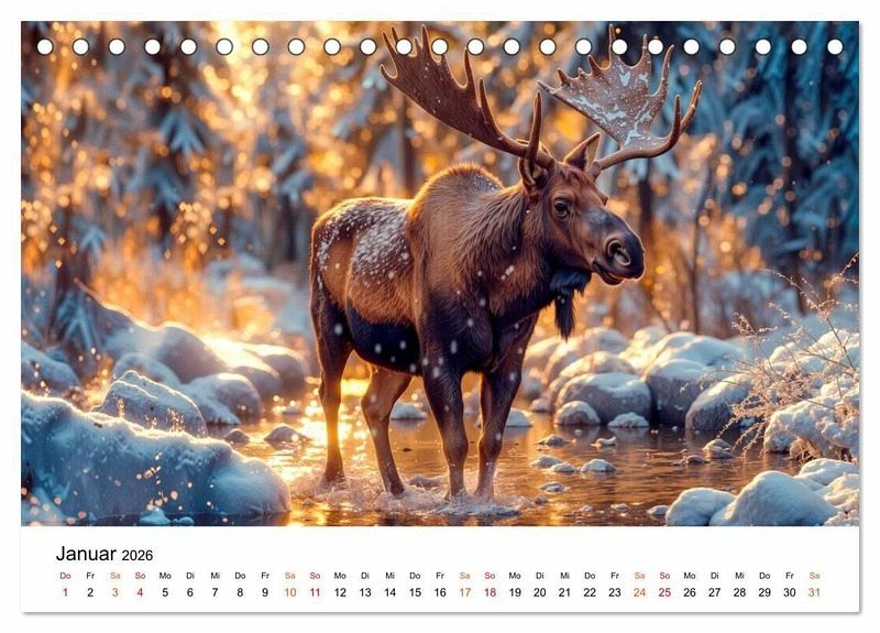 Januar: Ein Elch an einem Wintertag - in seiner Lieblingsumgebung: Wald, Wasser und Sträucher