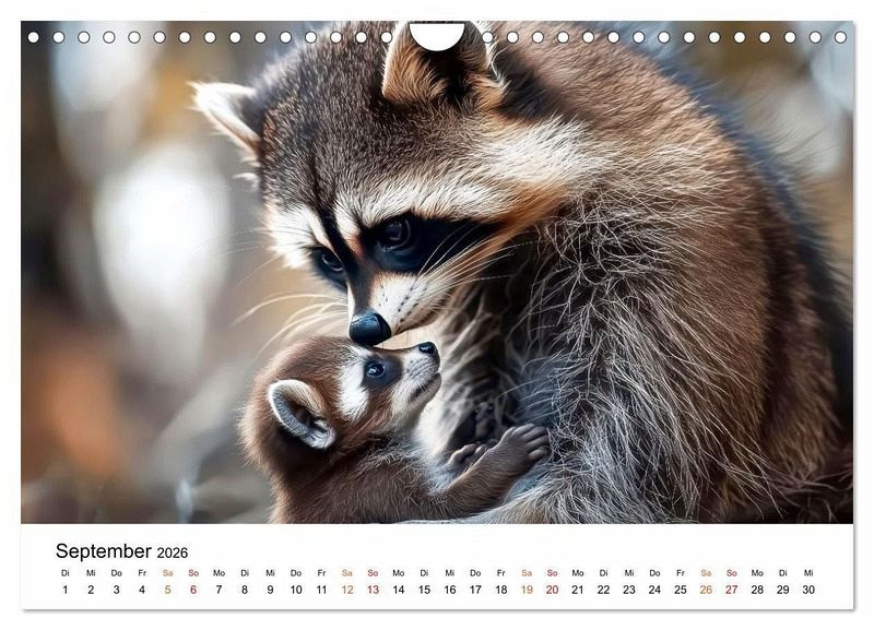 September: Eine Waschbärmutter, die ihr Junges zärtlich im Arm hält