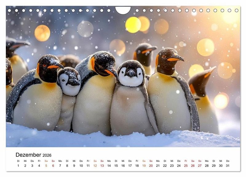 Dezember: Brütende Kaiserpinguine, eng aneinandergeschmiegt im antarktischen Schnee