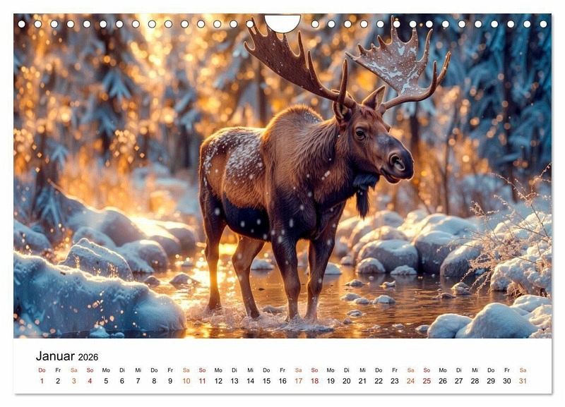 Januar: Ein Elch an einem Wintertag - in seiner Lieblingsumgebung: Wald, Wasser und Sträucher