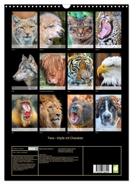 QUALITÄT - Hochwertiger Fotokalender mit 12 wunderschönen Motiven auf lichtbeständigem Bilderdruckpapier, robuste Spiralbindung mit Aufhängebügel.NACHHALTIG - deutliche Abfallreduzierung durch bedarfsgerechte Einzelstückfertigung, umweltfreundliches FSC-zertifiziertes Papier, Produktion in Deutschland, klimabewusste Logistik.PERFEKTES GESCHENK - Kalender für Freunde und Familie, für Kinder und Erwachsene, jung und alt, zu Weihnachten, Geburtstag oder zwischendurch.VIELFALT - Bildkalender in verschiedenen Formaten, z.B. DIN A5, DIN A4, DIN A3 sowie DIN A2. Ob Naturmotiv, Gemälde oder Fotos, ideal für ein persönliches Wohlfühlambiente.Auch Tiere haben eine eigene Persönlichkeit und sind im Charakter sehr unterschiedlich, frech, gefährlich, ängstlich oder auch draufgängerisch. von Autor(in): Peter Roder