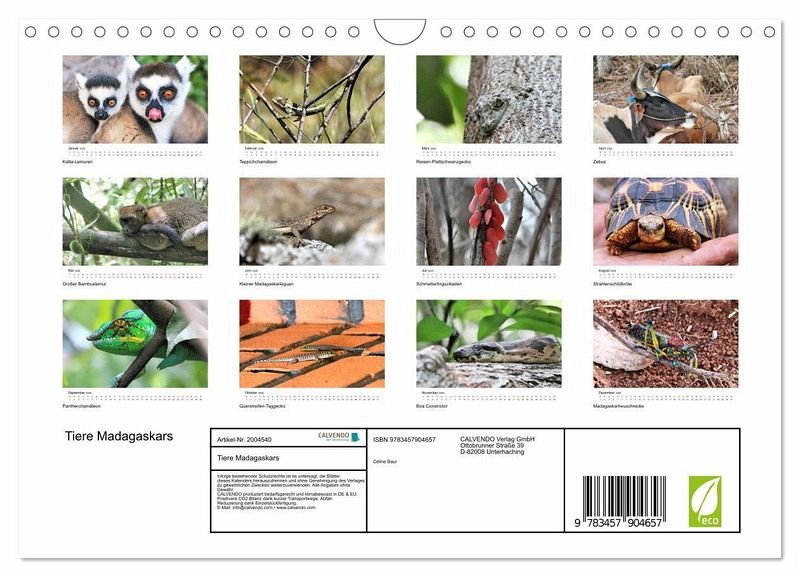 QUALITÄT - Hochwertiger Fotokalender mit 12 wunderschönen Motiven auf lichtbeständigem Bilderdruckpapier, robuste Spiralbindung mit Aufhängebügel.NACHHALTIG - deutliche Abfallreduzierung durch bedarfsgerechte Einzelstückfertigung, umweltfreundliches FSC-zertifiziertes Papier, Produktion in Deutschland, klimabewusste Logistik.PERFEKTES GESCHENK - Kalender für Freunde und Familie, für Kinder und Erwachsene, jung und alt, zu Weihnachten, Geburtstag oder zwischendurch.VIELFALT - Bildkalender in verschiedenen Formaten, z.B. DIN A5, DIN A4, DIN A3 sowie DIN A2. Ob Naturmotiv, Gemälde oder Fotos, ideal für ein persönliches Wohlfühlambiente.Säugetiere, Reptilien und Insekten aus Madagaskar von Autor(in): Céline Baur
